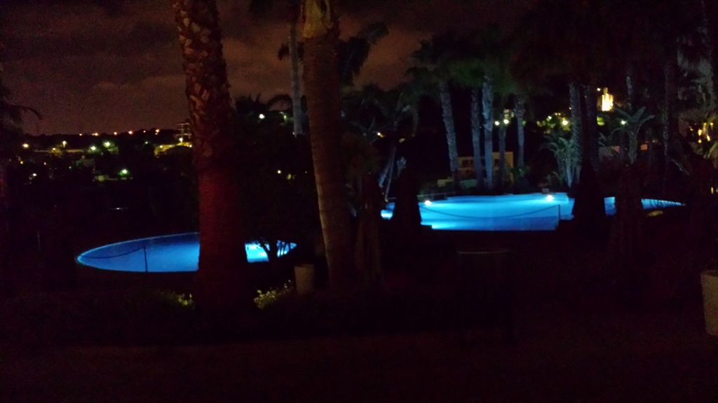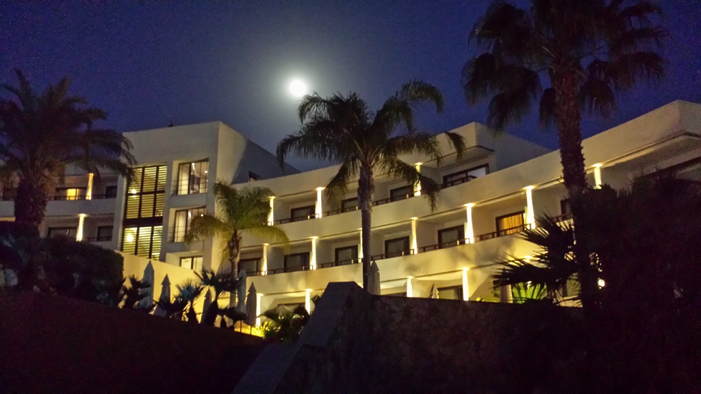 Here you can see the hotel accommodation and the palm trees lit by moonlight.