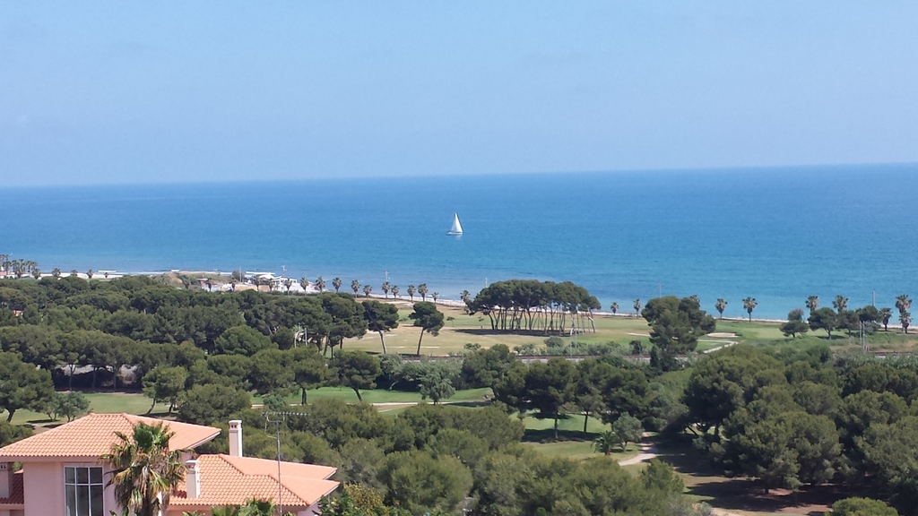 In the distance is a small yacht on the Mediterranean sea and in the foreground is a gold course.